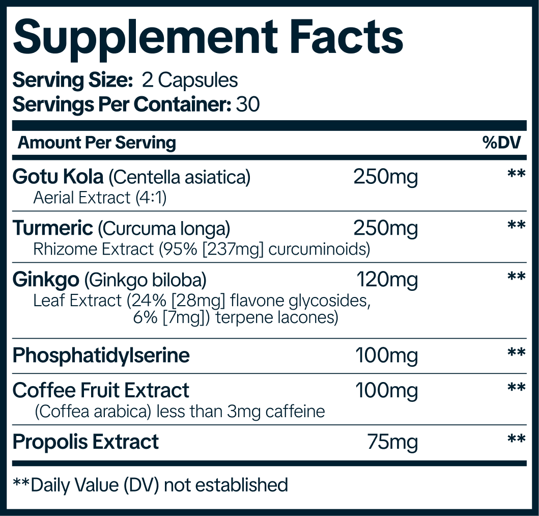 Phosphatidylserine for neurotransmitter health, gotu kola and coffee fruit extract for neuron health,